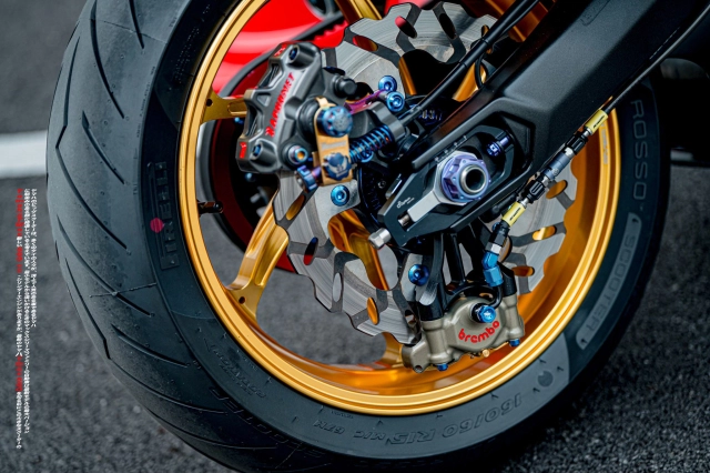 Lốp xe sử dụng loại Pirelli Rosso, nổi tiếng với độ bám đường cao, giúp xe vận hành ổn định trên nhiều điều kiện mặt đường khác nhau. Phuộc sau Marzocchi bình dầu rời mang đến sự êm ái, ổn định khi vào cua và di chuyển trên những cung đường gồ ghề.