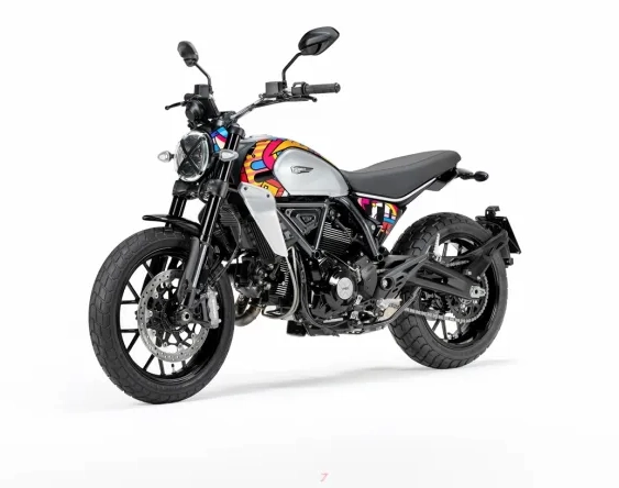 Ý tưởng đặc biệt này đã truyền cảm hứng cho tài năng của Van-Orton Design - một bộ đôi người Ý trong số những người tiên phong quan trọng nhất của nghệ thuật kỹ thuật số châu Âu, trong việc tạo ra bộ vỏ kit độc đáo và đầy màu sắc này, nơi bản sắc nghệ thuật của họ hòa quyện với sự sáng tạo của Ducati Scrambler.