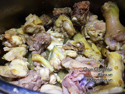Bước 6: Bắc nồi lên bếp, thêm 1 tô nước đun sôi. Khi nước sôi, cho phần gà đã xào ở trên vào nấu chín. Nêm nếm vừa ăn.