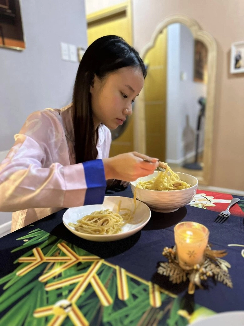 Con gái ca sĩ Thu Phượng say sưa thưởng thức món spaghetti, được kết hợp cùng nước sốt đậm đà và thịt xông khói trong bữa tối đầy ấm cúng và giản dị tại nhà.