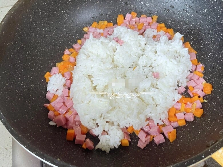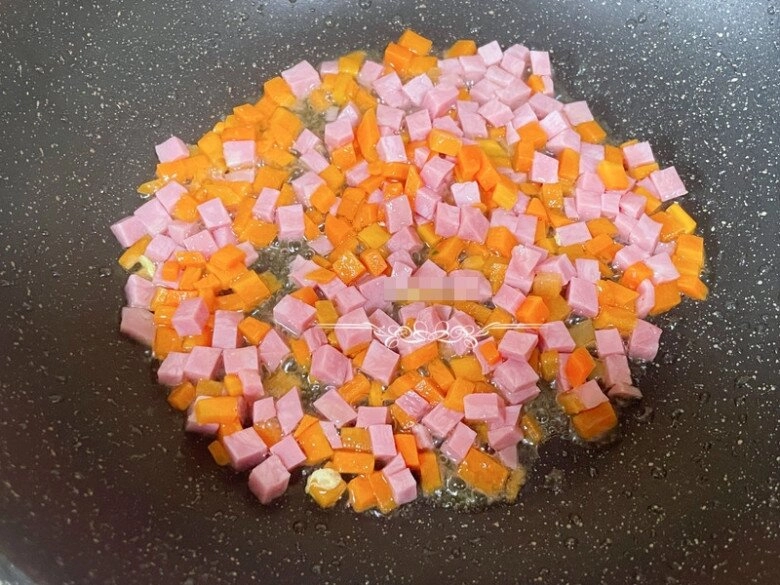 Vẫn trong chảo đó, thêm giăm bông, cà rốt thái hạt lựu vào xào cho cà rốt chín.