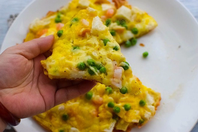 - Sau đó đổ trứng phủ đều lên mặt bánh, trứng sẽ lan đều, gặp nóng, trứng đông lại sẽ gắn kết các phần bánh lại với nhau như một chiếc pizza.