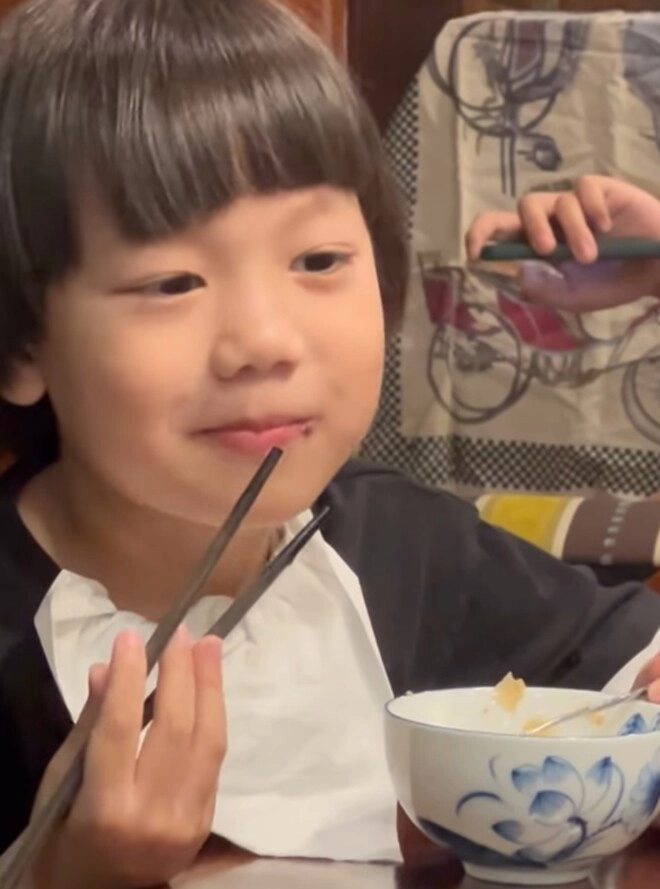 Món ăn làm nhiều người nhớ tới hương vị Tết. Cu Bão - con trai thứ 3 của Xuân Bắc ăn ngon lành canh măng mẹ nấu và vui vẻ khi được hỏi tên món ăn.
