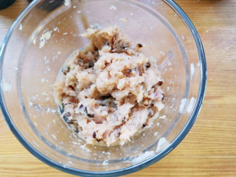 Nấm hương ngâm cho mềm rồi rửa sạch, băm nhỏ, cho vào thịt gà.