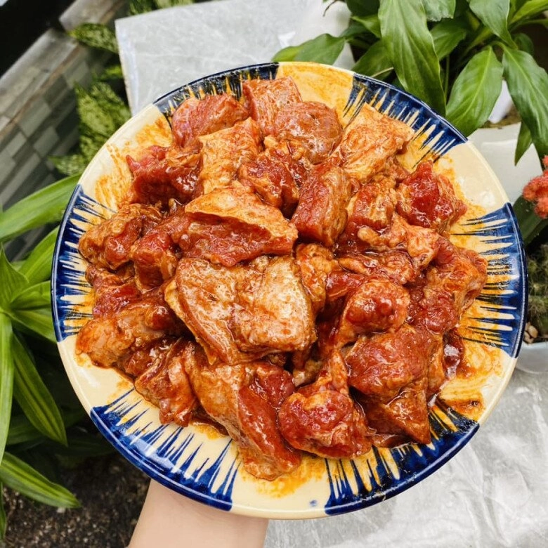 - Thịt bò sau khi mua về thì dùng muối chà xát vào thịt bò, rồi để yên trong vòng 5 phút thì rửa lại với nước sạch và để ráo. Sau đó thái thịt bò thành các khối vuông vừa ăn.