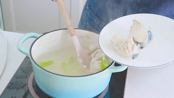 Luộc đến khi gà chín vừa tới, vớt ra, để nguội và xé nhỏ.