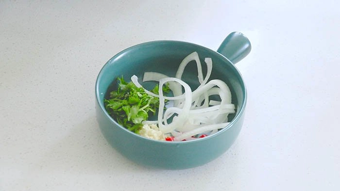 Tỏi đập dập, băm nhỏ, hành tây thái khoanh tròn, rau mùi tây nhặt lá, bỏ cuống.