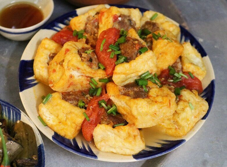 Đậu phụ khoét ở giữa. Thịt băm trộn đều với hành lá thái nhỏ, phần đầu phụ khoét bỏ và bị thừa cùng chút bột canh. Nhồi nhân thịt vào các miếng đậu phụ rồi đem rán chín vàng.
