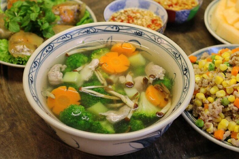 Phi thơm ít hành khô, cho thịt nạc vào đải cho thơm rồi thêm nước vào. Đun sôi rồi thả cà rốt tỉa hoa, súp lơ đã sơ chế sạch, nấm kim châm vàng đã sơ chế sạch vào. Nấu sôi khoảng 3 phút rồi nêm muối vừa ăn. Nấu thêm khoảng 30 giây - 1 phút nữa là tắt bếp.