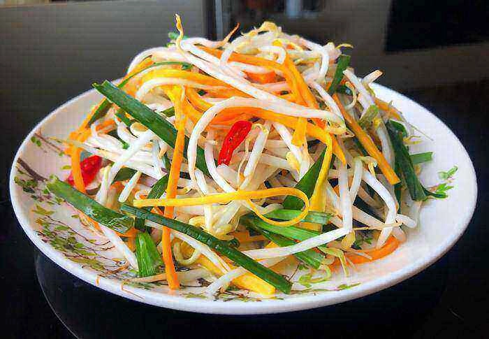 Chuẩn bị: - Giá đỗ: 350-400g - Lá hẹ: 100g - Cà rốt: 1 củ - Hành tím: 4-5 củ - 2 trái ớt - Muối, đường, giấm, nước đun sôi để nguội.