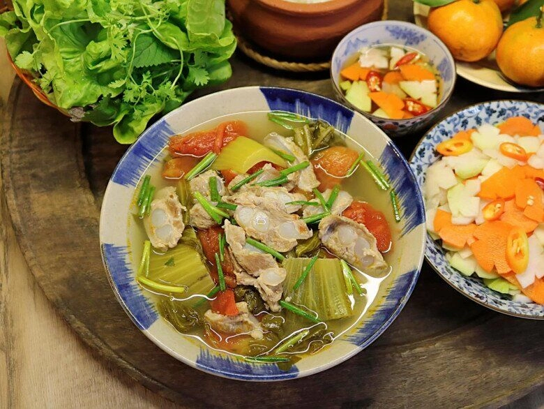 Chuẩn bị: 2 bát dưa cải chua, 200g sườn sụn thái lát mỏng, cà chua 1 quả, hành lá, muối, dầu ăn.