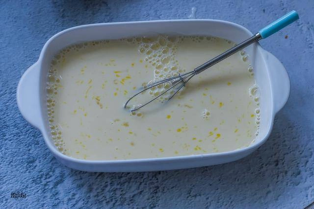Đổ sữa, trứng, đường vào khay nướng và trộn đều cho tan đường.