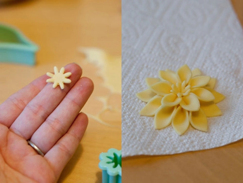 Bước 4: Dùng khuôn cắt bông hoa nhỏ xíu để cắt fondant, số lượng cũng tùy thuộc vào số lượng bông hoa mà bạn định làm. Sau đó, dùng cọ quét nước vào bông hoa nhỏ, gấp bông hoa lại một chút rồi đặt vào giữa bông hoa lớn để tạo nhụy hoa.