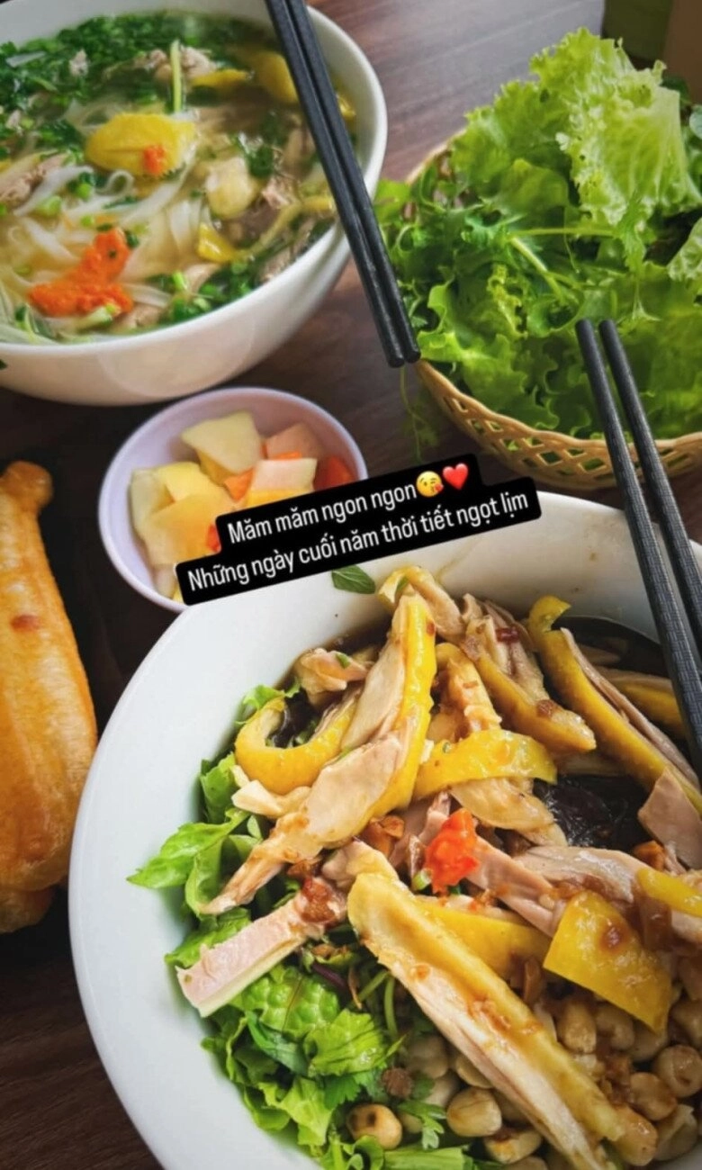 Một bữa ăn được nữ MC đăng tải sau đám cưới lần 2. Bát phở gà với nước dùng trong đầy ắp thịt gà. Bên cạnh là một bát miến trộn rau sống hấp dẫn không kém. Nàng tân nương thích thú tận hưởng trong những ngày đông cuối năm rét ngọt.