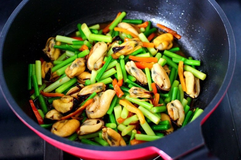 Cho vẹm đã chần vào xào nhanh và đều trên lửa lớn.