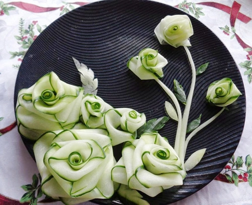 Có nhiều cách tỉa dưa chuột đẹp nhưng hoa từ dưa chuột như trong hình trên là phổ biến và được nhiều chị em đang sử dụng. Tỉa bông hoa từ dưa chuột này không hề khó, chỉ với quả dưa chuột nhỏ dài và dụng cụ nạo. Dùng dụng cụ nạo dưa chuột thành các lát mỏng rồi cuộn lại là được. Tham khảo cách làm chi tiết tại đây.