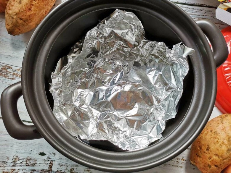 - Mục đích của việc sử dụng những viên giấy bạc là để nâng cao khoai lang và ngăn chúng dính trực tiếp vào đáy nồi để tránh bị cháy.