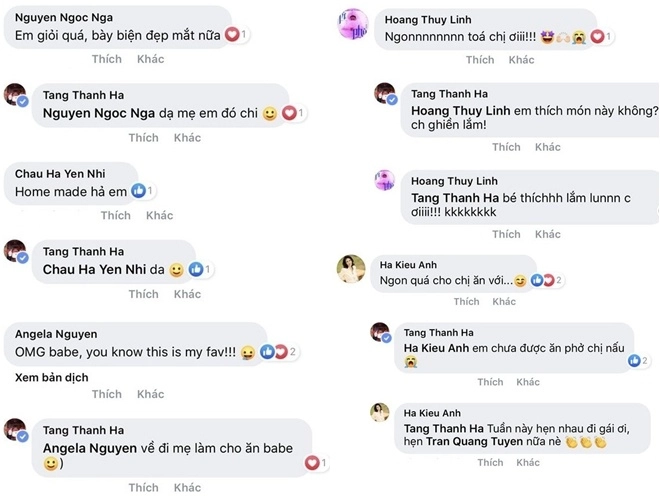 Món bún chả chấm được đi kèm rau, các loại gỏi. Sau khi xong xuôi, Hà Tăng còn trình bày để thêm phần "kích thích". Món ăn dân dã mà Tăng Thanh Hà chia sẻ ngay lập tức làm nhiều bạn bè thèm thuồng. Lê Thuý, Gia Bảo cùng nhiều người đều nhận xét "Ui ngon quá", thậm chí muốn Hà Tăng "ship" cho một phần.