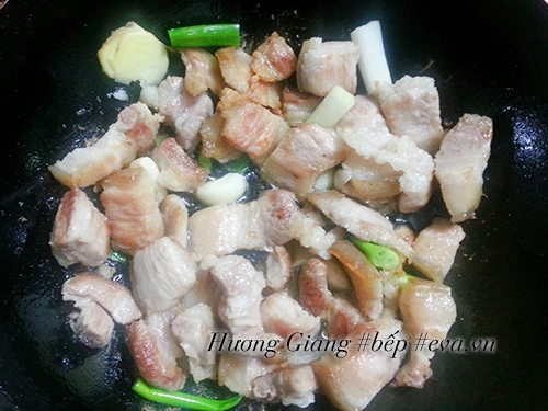Bước 2: Cho thịt vào nồi, bật bếp lửa vừa, xào sơ qua cho thịt sém vàng và ra bớt mỡ. Sau đó gạt thịt sang 1 góc chảo, cho gừng, hành lá, tỏi xào cho thơm rồi cho đường vào xào cho đường ngả màu cánh gián.