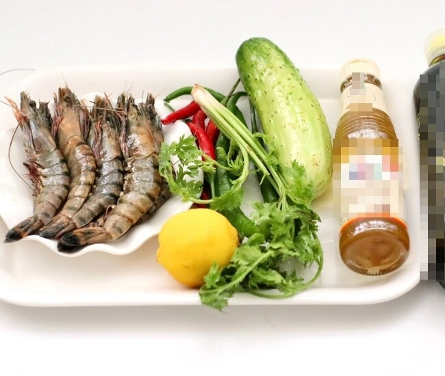 - 500g tôm, 1 quả dưa chuột lớn, 1 quả chanh vàng, 3 quả ớt xanh, 3 quả ớt đỏ, 1 nhánh rau mùi, 1 nhánh hành lá, 1 tép tỏi, 2 lát gừng, 2 muỗng canh nước tương, 2 muỗng canh giấm, 1 thìa đường trắng, 1 thìa bột ớt, muối vừa ăn, một ít vừng trắng rang.