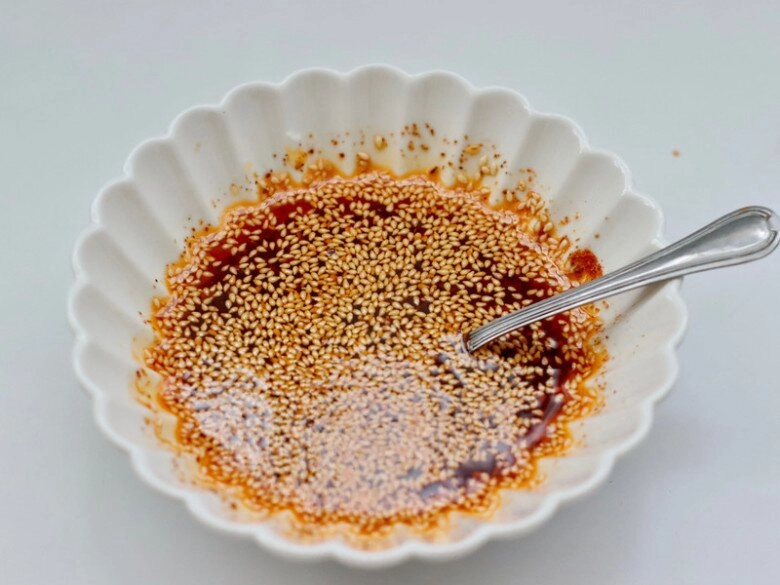 Làm nước sốt chua cay: Cho bột ớt, đường, lượng muối thích hợp và hạt vừng vào tô. Sau đó, đun nóng một muỗng canh dầu ăn rồi đổ vào bát sốt. Thêm giấm, thêm nước tương vào. Khuấy đều.