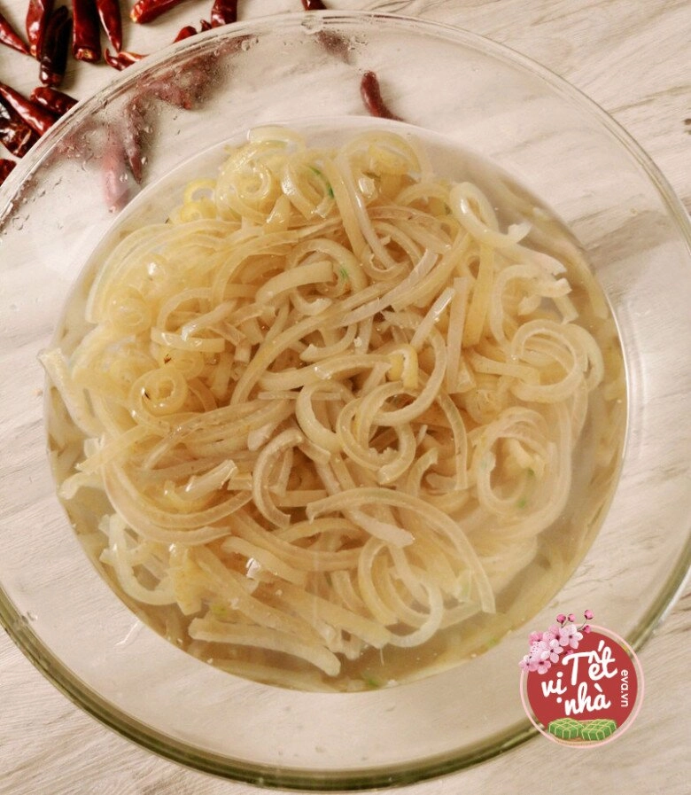 - Cho bì lợn vào nồi cùng hành lá, lát gừng, rượu nấu ăn. Đun sôi trong 20 phút để khử mùi và làm mềm.