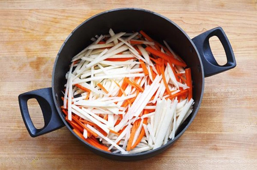 - Ngâm tôm khô vào nước ấm trong 2 giờ hoặc qua đêm trong tủ lạnh. Gọt vỏ củ đậu, cà rốt rồi thái sợi dài. Cho vào nồi, thêm muối và một chén nước, sau đó giảm lửa nhỏ, đun sôi khoảng 15 phút hoặc cho đến khi hơi mềm.