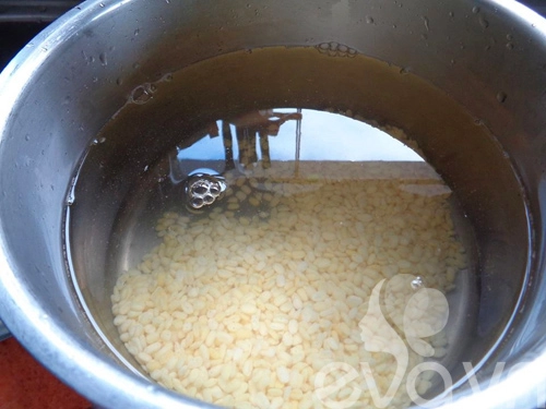 Bước 1: Cho vào nồi 2 lít nước lạnh, đậu xanh. Bắt lên bếp nấu cho đậu chín mềm. Sau đó, lá dứa, nước hạt sen và bột khoai vào nồi nấu tiếp, nhớ lấy muôi khuấy đều để bột khoai không dính nồi.
