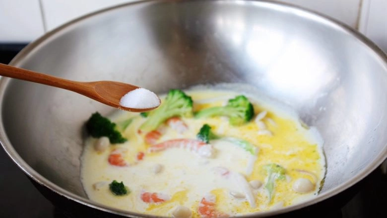 - Đổ bơ vào nồi, đun nhỏ lửa đến kho bơ tan chảy. Cho súp lơ, nấm và tôm vào xào cho thơm.