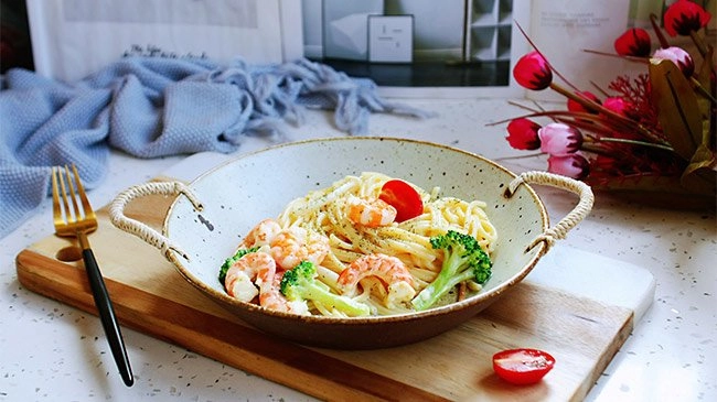 - 120gr mỳ ống, 90gr kem sữa tươi (kem whipping), 20gr bơ nhạt, 50gr nấm (tùy loại), 50gr súp lơ xanh, gia vị, tiêu đen, dầu oliu, lá húng quế khô nghiền nhỏ, 5 – 6 con tôm.