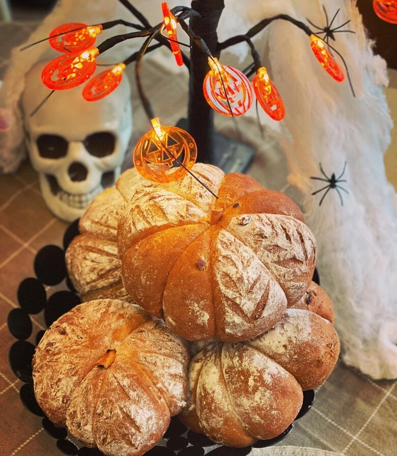 Chiếc bánh mì được tạo hình thành quả bí ngô đặc trưng Halloween, với lớp vỏ xù xì mang phong cách cổ điển nhưng lại rất lôi cuốn.