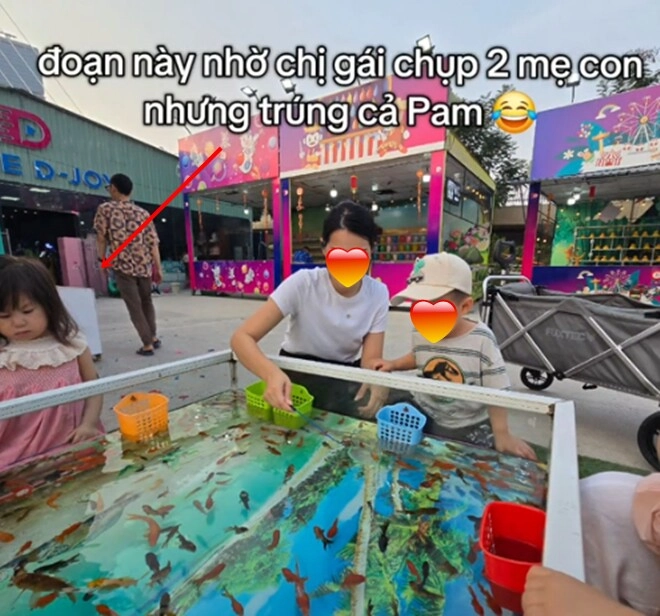 Tuy nhiên, trong khi đang ngồi cùng con trai hăng say chơi trò vớt cá, người mẹ chợt nhận ra bé gái bên cạnh là một người rất quen.