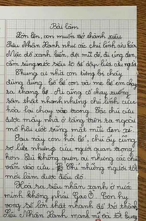 Nguyên văn bài viết của nhóc tỳ như sau: “Lớn lên, con muốn trở thành siêu nhân xanh như các chú lính cứu hỏa mặc đồ xanh biển, đội mũ đỏ, đi ủng đen, cầm súng nước siêu to để dập lửa cứu người.