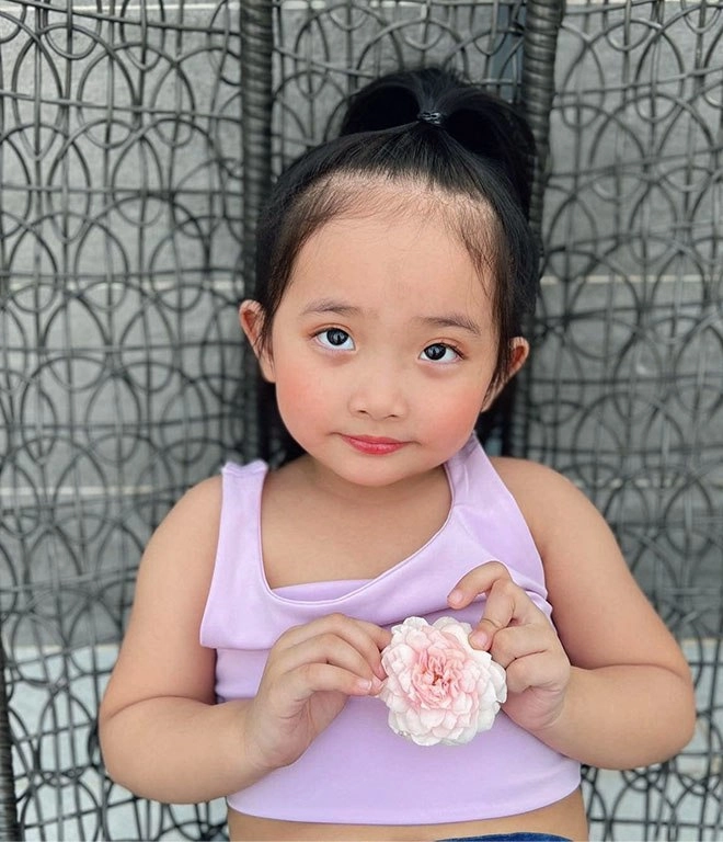 Con cười tươi như hoa, trông hoạt bát và rạng rỡ quá chừng.