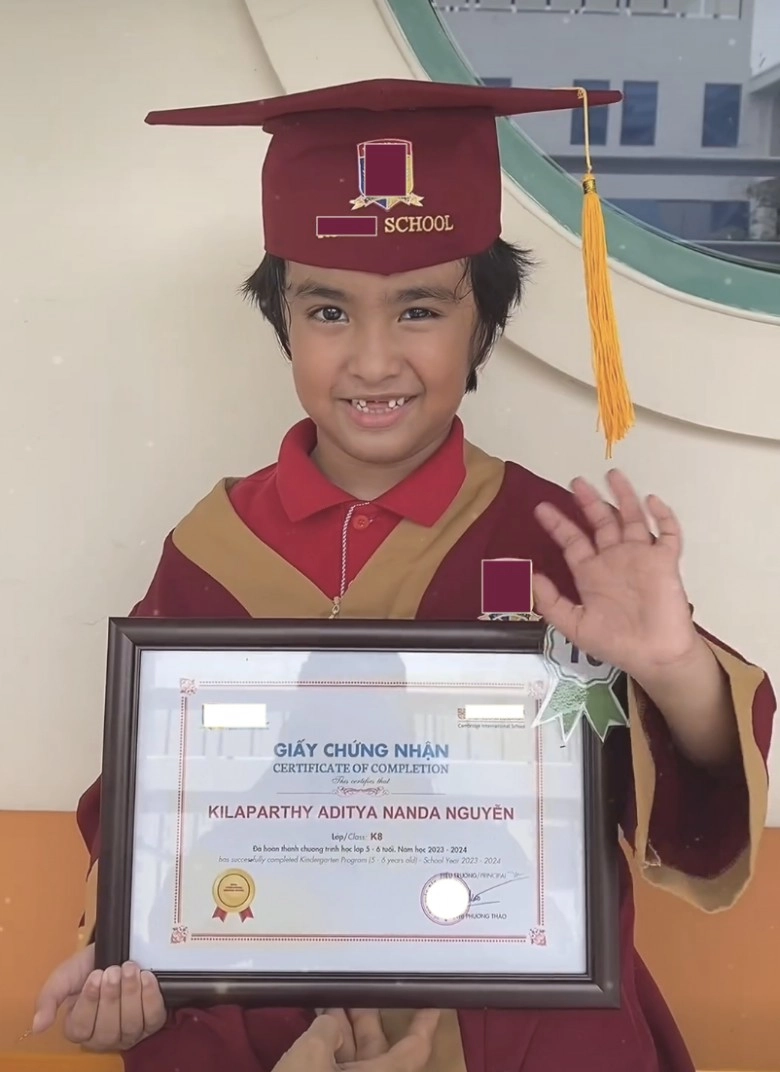 Con trai Nguyệt Ánh chuẩn "trai Ấn" với làn da ngăm đen, trông lớn hẳn khi sắp vào lớp 1.