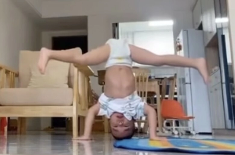 Trong video, cậu nhóc sơ sinh cũng trải thảm như bao người lớn, bé tập hết động tác này đổi qua động tác khác. Nhìn là biết đứa trẻ đã tập tành từ lâu, hoặc là bắt chước mẹ hoặc là xem qua tivi rồi học theo, nếu không thì làm sao có thể biểu diễn điêu luyện như thế.