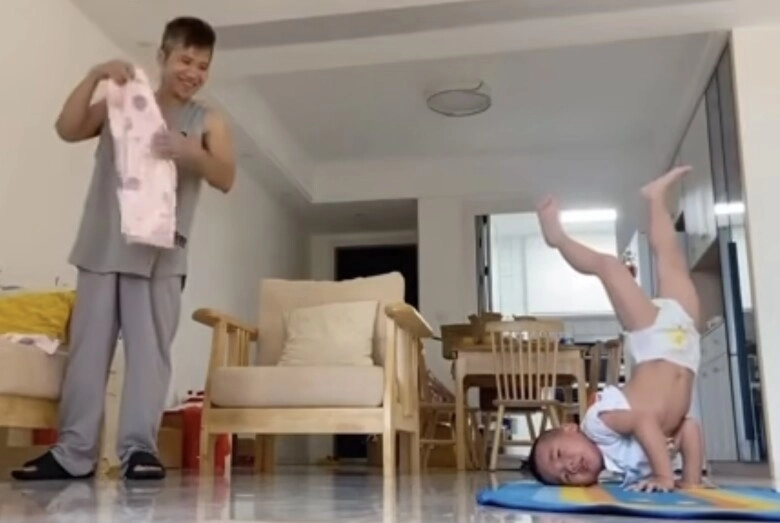 Tuy vậy, nhiều phụ huynh vẫn thót tim trong quá trình theo dõi buổi tập của em bé sơ sinh này, vì lo sợ cậu nhóc sẽ bị ngã chấn thương. Trong lúc bé trai luyện tập, một người đàn ông được suy đoán là bố của nhóc tỳ từ đâu di chuyển vào phòng khách, rồi tranh thủ sắp xếp, gập gọn quần áo.
