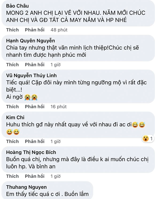 Một số cư dân mạng bày tỏ: "Mong sao 2 người quay về bên nhau", "Tấm ảnh gia đình đẹp quá", "Ôi tiếc cho một gia đình đẹp, thương chị. Cố lên chị nhé",... Bên cạnh đó, mọi người cũng tán thưởng cách hành xử văn minh của cặp đôi. Lâm Khánh Chi không những không xoá ảnh cũ mà còn đăng thêm ảnh gia đình 3 người, phần nào giúp bé Thiên Long cảm nhận được dù có chuyện gì xảy ra, tình yêu của bố mẹ dành cho con mãi không thay đổi.