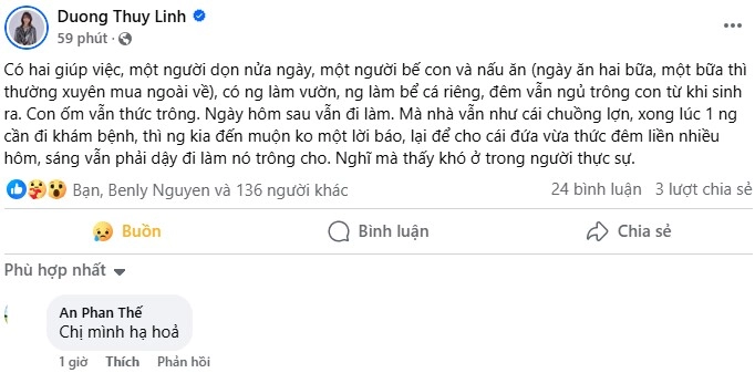 Cụ thể, Hoa hậu thân thiện Dương Thùy Linh đăng tải dòng trạng thái cho biết gia đình cô thuê 2 người giúp việc. Trong đó một người nhận nhiệm vụ dọn dẹp nhà cửa mỗi ngày còn một người giúp nấu ăn kiêm chăm sóc em bé thứ 2. Ngoài 2 người này, nhà cô luôn có người làm vườn và người dọn bể cá riêng.