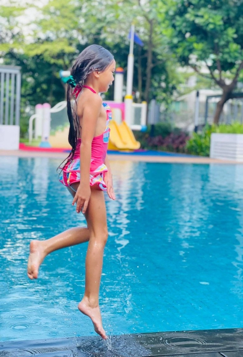 Trong cuộc sống hàng ngày, Sol là một cô bé hiếu động và yêu thích các hoạt động thể chất. Con theo mẹ chạy bộ, tập yoga, bơi lội - những bộ môn tốt cho việc phát triển vóc dáng.