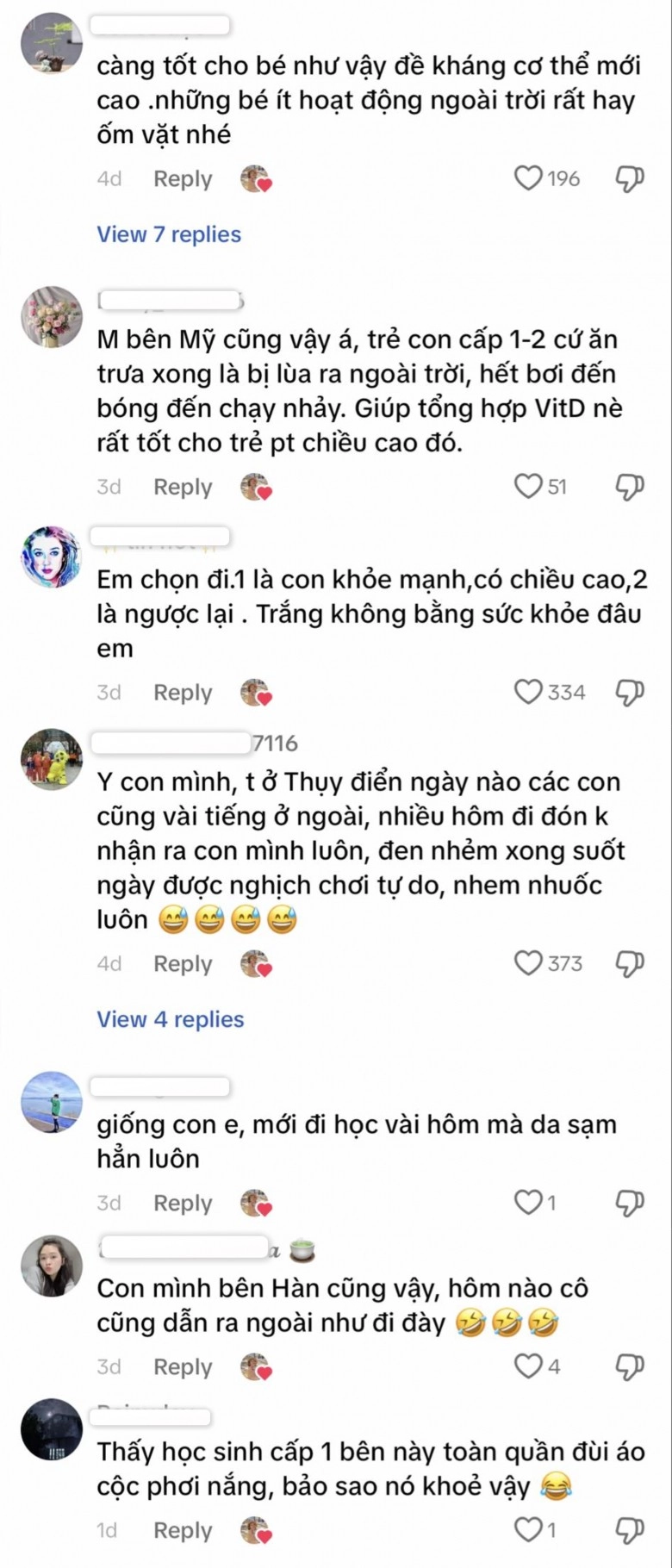 - Mình ở Thuỵ Điển, ngày nào các con mình cũng có vài tiếng học ở ngoài trời. Nhiều hôm đi đón mà mình còn không nhận ra con mình, đen nhẻm luôn.