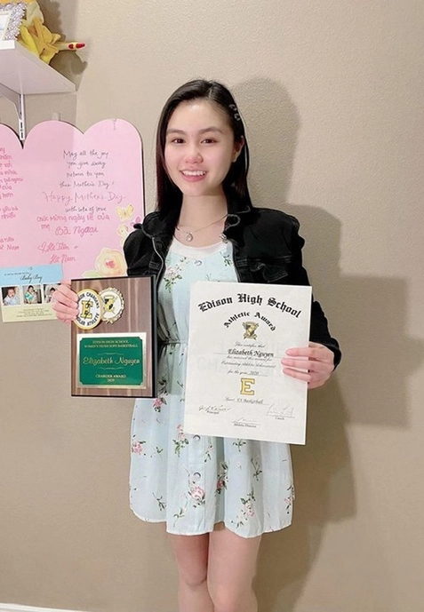 Bà mẹ 2 con chia sẻ: “Chúc mừng cô bé Hà Tiên của Mẹ!!! Năm nay Hà Tiên sẽ tốt nghiệp Trung Học Phổ Thông - High School tại Mỹ mà vui nhất là HT sẽ được mặc áo tốt nghiệp màu vàng (học sinh giỏi 2% trong toàn khối).