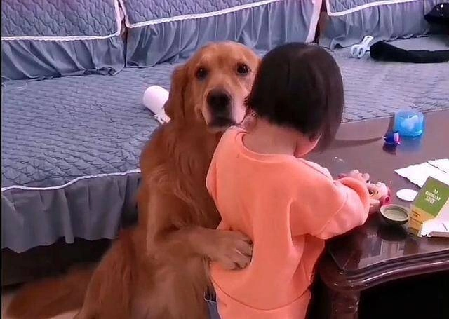 Không dừng lại ở đó, chú chó này còn có những hành động ôm ấp, dỗ dành cô chủ nhỏ giống như một người anh/chị đang bảo vệ em gái. Chứng kiến điều này, ai cũng phải “xiêu lòng” vì quả thực nó quá sức đáng yêu.