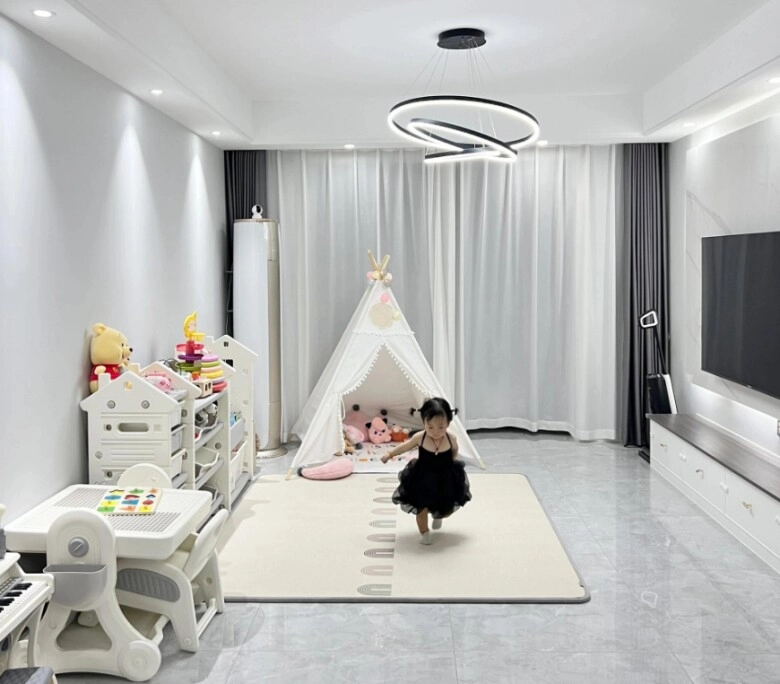Các gia đình có trẻ nhỏ có thể hoàn toàn loại bỏ ghế sofa, và biến phòng khách thành một khu vui chơi cho cả cha mẹ và con cái. Điều này không chỉ tạo ra một không gian rộng rãi để trẻ em thoải mái vui đùa, mà còn giúp gắn kết tình cảm gia đình thông qua các hoạt động chung.