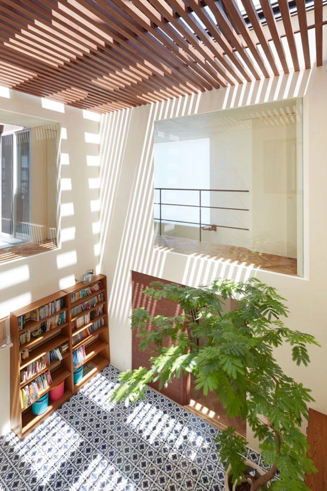 Giếng trời rộng thênh thang được bố trí ở khu vực trung tâm, bên trên lắp cửa kính, bên dưới là hệ thống lam gỗ tạo bóng đổ mang nét thẩm mỹ riêng khi ánh sáng chiếu rọi vào. Đây cũng chính là khoảng thông tầng, giúp cả 2 tầng nhà đều đủ sáng.