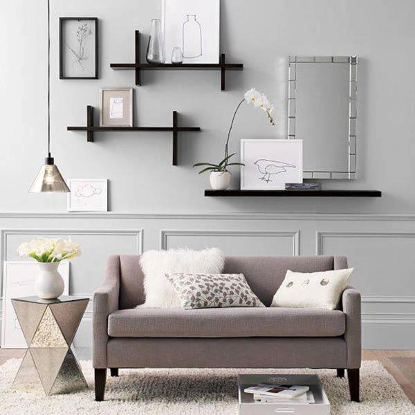 Bạn hoàn toàn có thể sử dụng loại tivi treo tường ở phía trước, còn khoảng tường phía sau có thể gắn những chiếc kệ lửng để đặt đồ lưu niệm, những bình hoa hay những đồ vật nho nhỏ thay vì đặt tủ thì sẽ tiết kiệm được rất nhiều không gian.