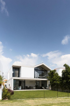 Theo yêu cầu của gia chủ, các kiến trúc sư đã thiết kế sân trước thành một sân gôn nhỏ, phủ đầy cỏ xanh. Không chỉ đảm bảo chức năng giải trí mà còn là giải pháp thực tế mang lại, ánh sáng và thông gió cho toàn bộ căn nhà.