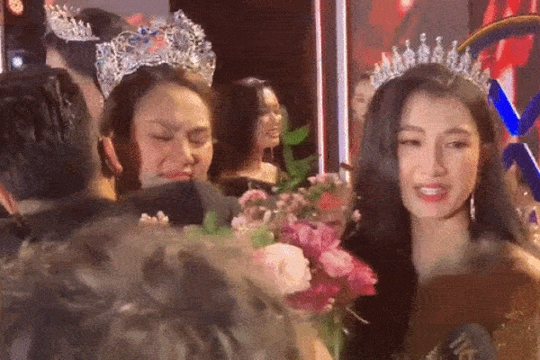 Trong đêm chung kết, người kế nhiệm Tường San là Phương Nhi cũng bị rơi vương miện quý giá. Chân dài vội vàng đỡ nhưng vì tay cầm hoa và cúp nên không thể kịp.