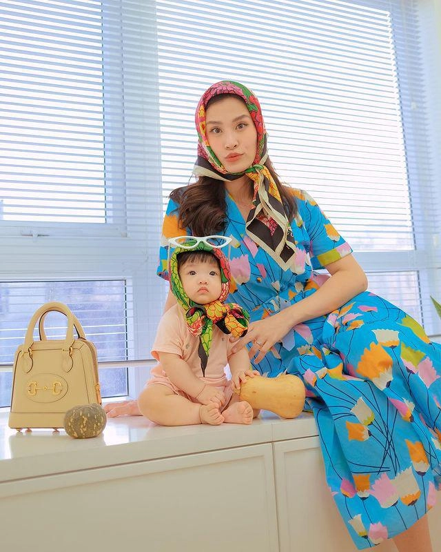 Cũng trong bối cảnh chụp đó, U35 thay liền một set đồ khác từ Gucci. Cô không quên rủ bé con góp vui cùng và liền lập tức gây sốt vì sự đáng yêu này. Đông Nhi 1 lần nữa khẳng định sự hot hit của chiếc khăn lụa được cột lên đầu theo phong cách khăn mỏ quạ xa xưa.