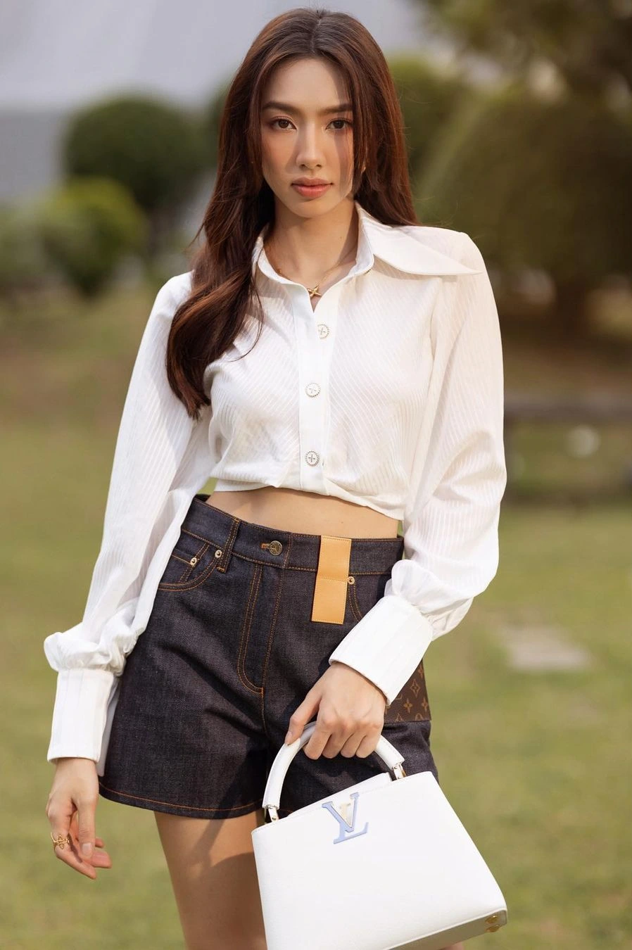 Điểm đặc biệt trong cách phối đồ của Thùy Tiên chính là cách tối giản phụ kiện nhưng vẫn toát lên vẻ cuốn hút. Đôi khi chỉ cần một chiếc đồng hồ sang trọng, một đôi giày mũi nhọn hoặc một chiếc túi xách hàng hiệu vừa đủ tinh tế đã giúp cô nâng tầm phong cách.